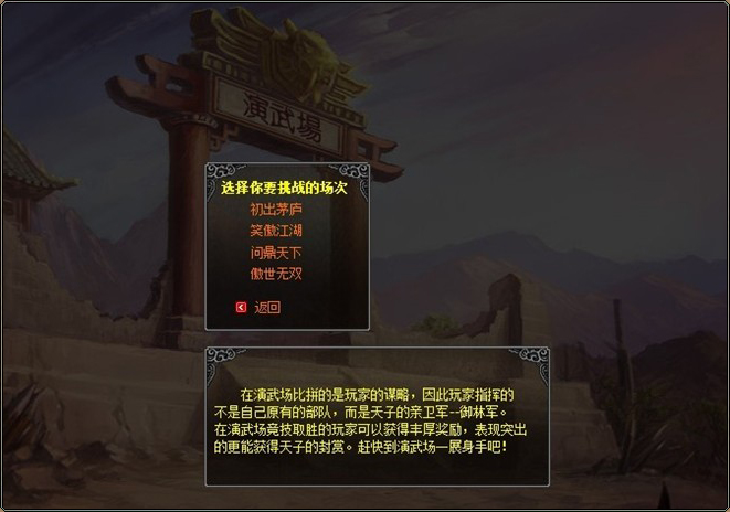 在演武场比拼的是玩家们的谋略,因此玩家指挥的不是自己原有的部队,而是天子的亲卫军——御林军。在演武场竞技取胜的玩家可以获得丰厚奖励,表现突出的更能获得天子的封赏。赶快到演武场一展身手吧!