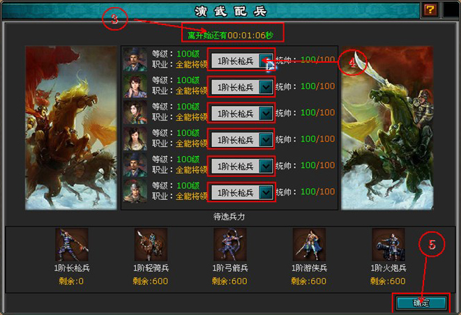 配对成功后,可在将领的右边点击下拉框选择兵种,完成配兵,点击“确定”按钮,等待对手确定,对手确定或倒计时结束后,进入战斗界面;如图:
